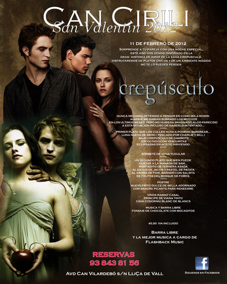 Sorprèn a la teva parella amb una nit especial el proper 11 de febrer! Aquest any Can Cirili s'ha inspirat en la gran història d'amor de la saga Crepuscle. Gaudireu de plats únics i d'un ambient màgic. No us ho podeu perdre!