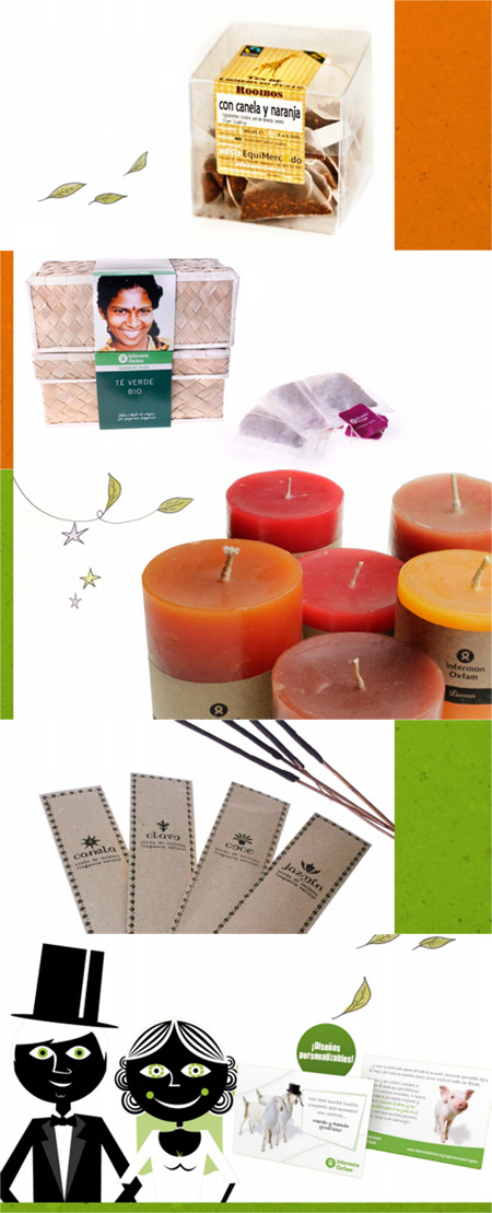 Sorprèn als teus convidats amb un detall de comerç just d’Intermón Oxfam. Pots escollir entre diversos regals (tes, xocolates, caramels, encens, punts de llibre, espelmes...), tots ells estan produïts amb matèries naturals respectant els drets de les persones i del medi ambient.